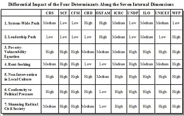 To conclude, the patchiness and unevenness of attitudes to civilian protection among IOs and INGOs owes to the combination of four agency-related internal and structure-related external factors deduced from the Mindanao investigation. The explanation of a complex dependent variable like this has to be multivariate and multi-level to capture all the effects. OXFAM managed to be more proactive on political rights than the other cases because of differential impact of these four factors as observed along the seven internal dimensions for each organisation (see Table II). It will be evident from the empirical sections of this essay that an IO or INGO that scores high on system-wide and leadership push and low on rent-seeking, poverty-vulnerability equation, non-intervention in local culture, political conformity and shunning of radical civil society will be more proactive towards protection.